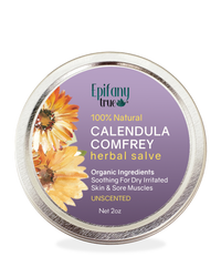 Our Epifany True 100% Natural Calendula and Comfrey salve is a soothing and deeply moisturizing natural herbal ointment, sometimes called a balm, made primarily from infused oils of calendula and comfrey, two medicinal plants known for their soothing and healing properties. This calendula and comfrey salve is fragrance-free. You will love the light, calming natural scent of the herbs, mixed with the wonderful scent of organic beeswax.