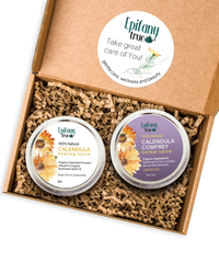 BUNDLE CONTAINS: 1 x Calendula Healing Salve 2oz and 1 x Calendula & Comfrey Herbal Salve 2oz. Packaged with care for your personal use, to share with your family, or as a great natural skincare gift set.
