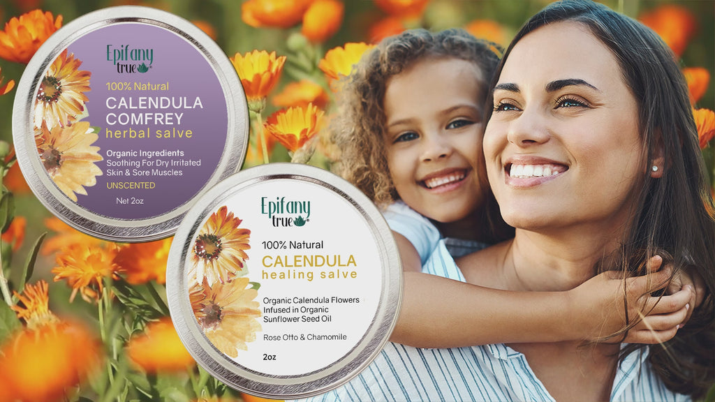 Epifany True Calendula salves are made with all organic ingredients to ensure the efficacy of natural skin care you can trust. Calendula oil has a rich history of being a gentle care aide to help dry, sensitive, delicate, and irritated skin. We infuse calendula flowers in powerful sunflower oil to make our base.