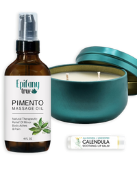 Pimento Massage Oil 4oz, Calendula Soothing Lip Balm, Rise Coconut Soy Candle with Essential Oils, Self-Care Gift 3-Piece Bundle
