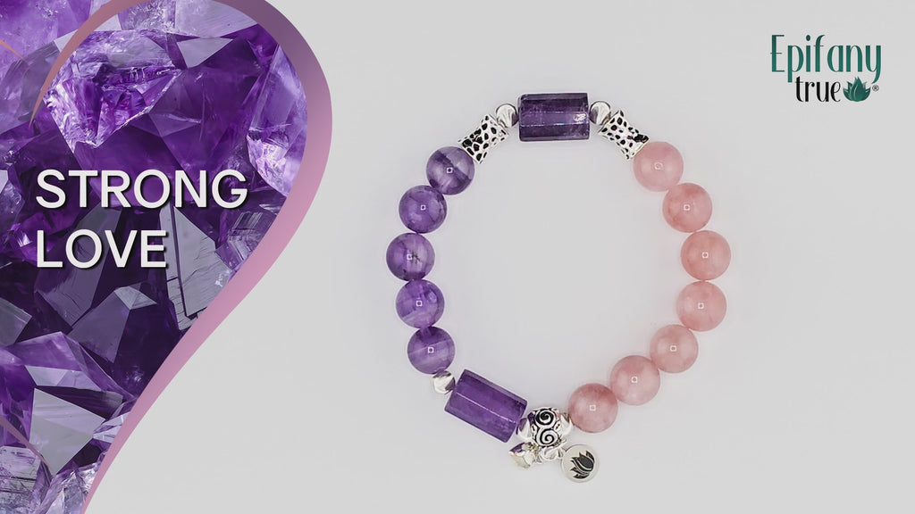 Introducing the Epifany True Strong Love Healing Intention Bracelet, a harmonious fusion of natural beauty and spiritual energy designed to nurture your heart and soul, with cancer awareness always at top of mind. Strong Love, made of Amethyst and Rose Quartz, is our 2023 signature bracelet, deliberately designed with two focal points for versatility, giving you the "freedom" to wear it however you feel - on a particular day. It is crafted with care - a testament to the power of love, healing, and good, wholesome intention. Let it serve as a daily reminder of your intentions, a symbol of your inner strength, and a conduit for love and healing. Wear it with pride, knowing that you carry the positive energy of amethyst and rose quartz with you wherever you go.